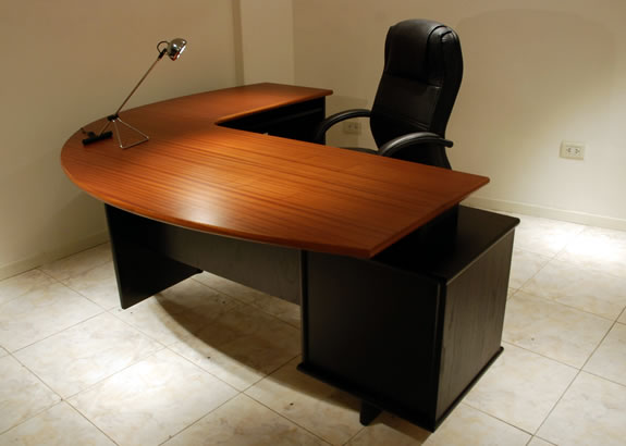Escritorio Gerencial de líneas curvas, con tapa de 30 mm. de espesor con cantos ½ caña, enchapada en madera con lustre poliuretánico, base en madera pintada color negro, con cajonera pedestal de 4 cajones y ala lateral con bandeja para teclados y porta CPU. Accesorios de la línea. Cajonera rodante, biblioteca con puertas corredizas o batientes, archivos para carpetas colgantes, mesa de reunión, armarios, escritorios rectos, etc.