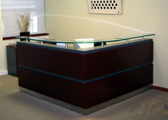 Muebles de Recepción realizados en diferente materiales, melaminas, chapas de maderas lustradas, pinturas gofradas, lacas poliuretánicas, solos o combinados con vidrio, aluminio, acero inoxidable y herrajes cromados o satinados, estándar o a medida, adaptándolos al espacio físico, necesidades o imagen corporativa que requiera cada caso en particular.
