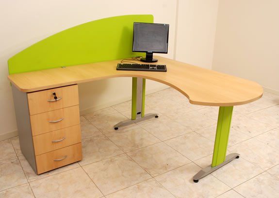 Muebles realizados con tapas en melamina de 25 mm. de espesor con cantos en ABS, rectas o curvas y paneles divisores entre ellos con patas metálicas unidas por estructuras tubulares pintadas en diferentes colores con ductos pasa cables. Accesorios de la línea. Mesa auxiliar, mueble auxiliar lateral, cajonera rodante, biblioteca con puertas corredizas o batientes, archivos para carpetas colgantes, mesa de reunión, armarios, mesas para PC, etc.